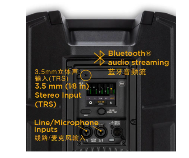 內置調音臺最多可以連接兩個線源或麥克風,帶有單獨的48V幻像電源和一個非平衡的立體聲源。它還可以管理來自Bluetooth®音頻流的無線立體聲信號。