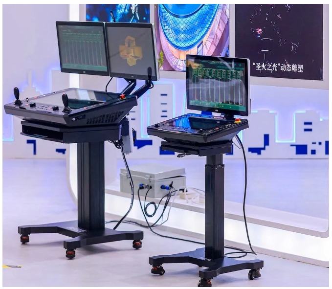 北特圣迪展出最新研發的兩款新型舞臺機械多信息集成交互控制臺,該控制臺對硬軟件性能和操控性進行了雙重提升,可實現高科技演藝裝備在不同應用場景下的精準、快速、便捷控制,分為標準型和便攜式兩個型號。新型控制臺人機交互界面更加友好,寬大的顯示屏使信息承載量大幅提升。內置工控機裝配強大CPU和高配置顯卡,使得運行更為流暢。內置的高速通訊接口(Profinet、EtherCat等),可快速收發主PLC的控制指令,從而進一步提升信息傳輸的實時性和可靠性。